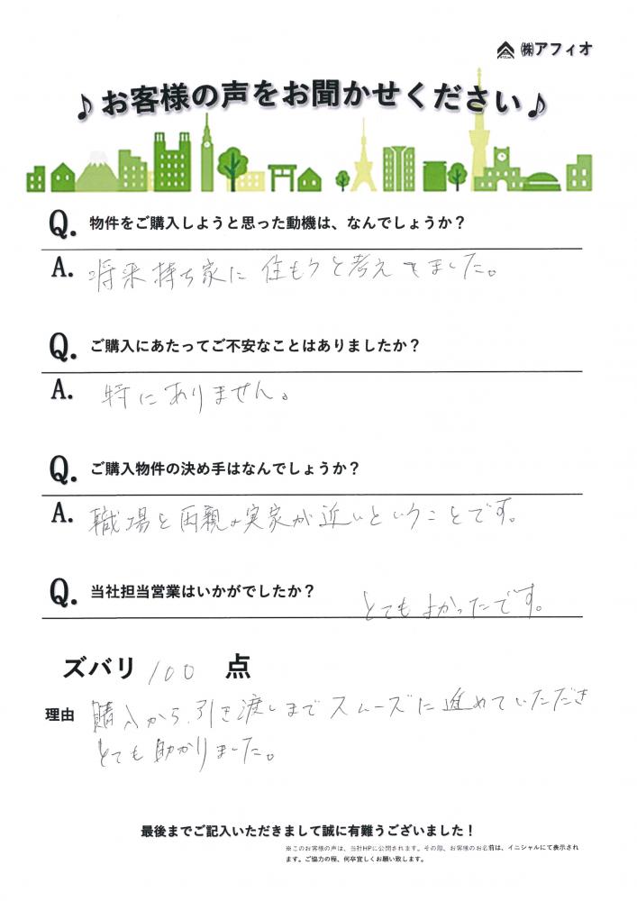 100点:購入から引き渡しまでスムーズに進めていただきとても助かりました。
