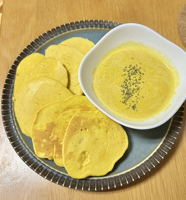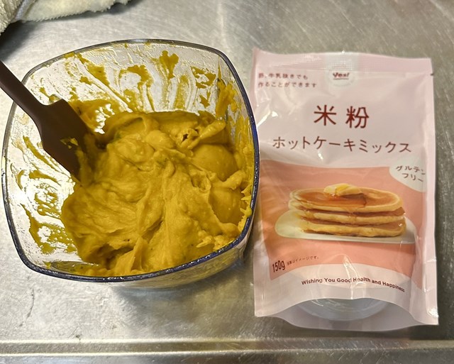 前から気になっていた米粉ホットケーキにかぼちゃペースト混ぜて