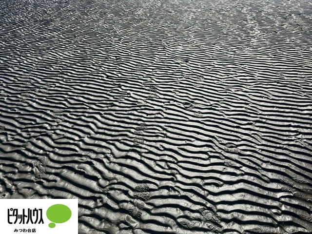 これは「リップルマーク」と呼ばれ、波や潮の流れによって砂が少しずつ動くことでできる、自然の模様だそうです。三番瀬のように遠浅で波が穏やかな場所では、この模様がきれいに残りやすいのだとか。