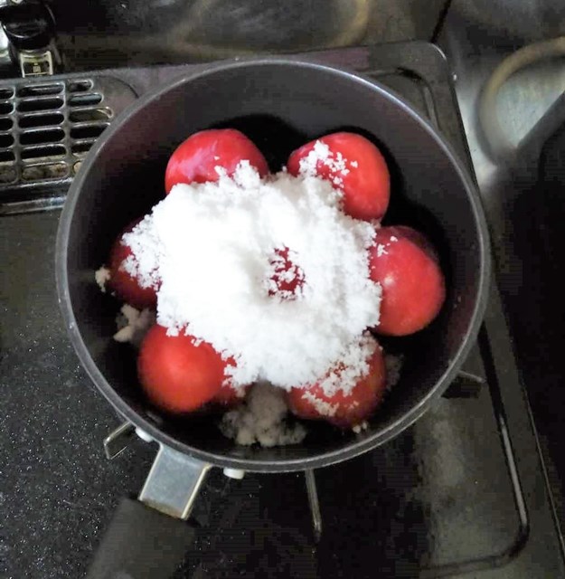 1パック食べきるのは大変なので、鍋にすももを並べて砂糖をモリモリ入れて、煮ると……