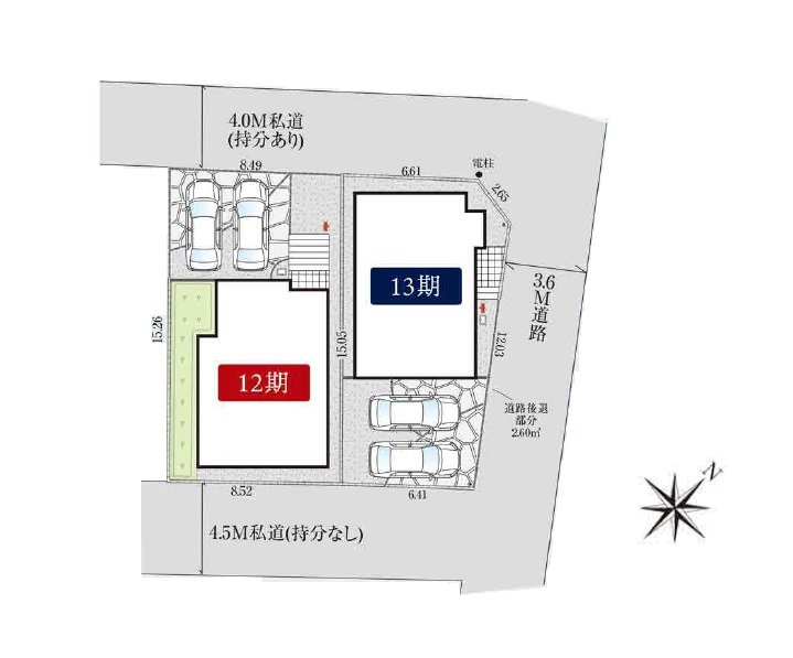 | 接道状況 | 北東側 3.6m 北西側 4.0m 南東側 4.5m | 延床面積 | 98.12㎡・99.98㎡ |